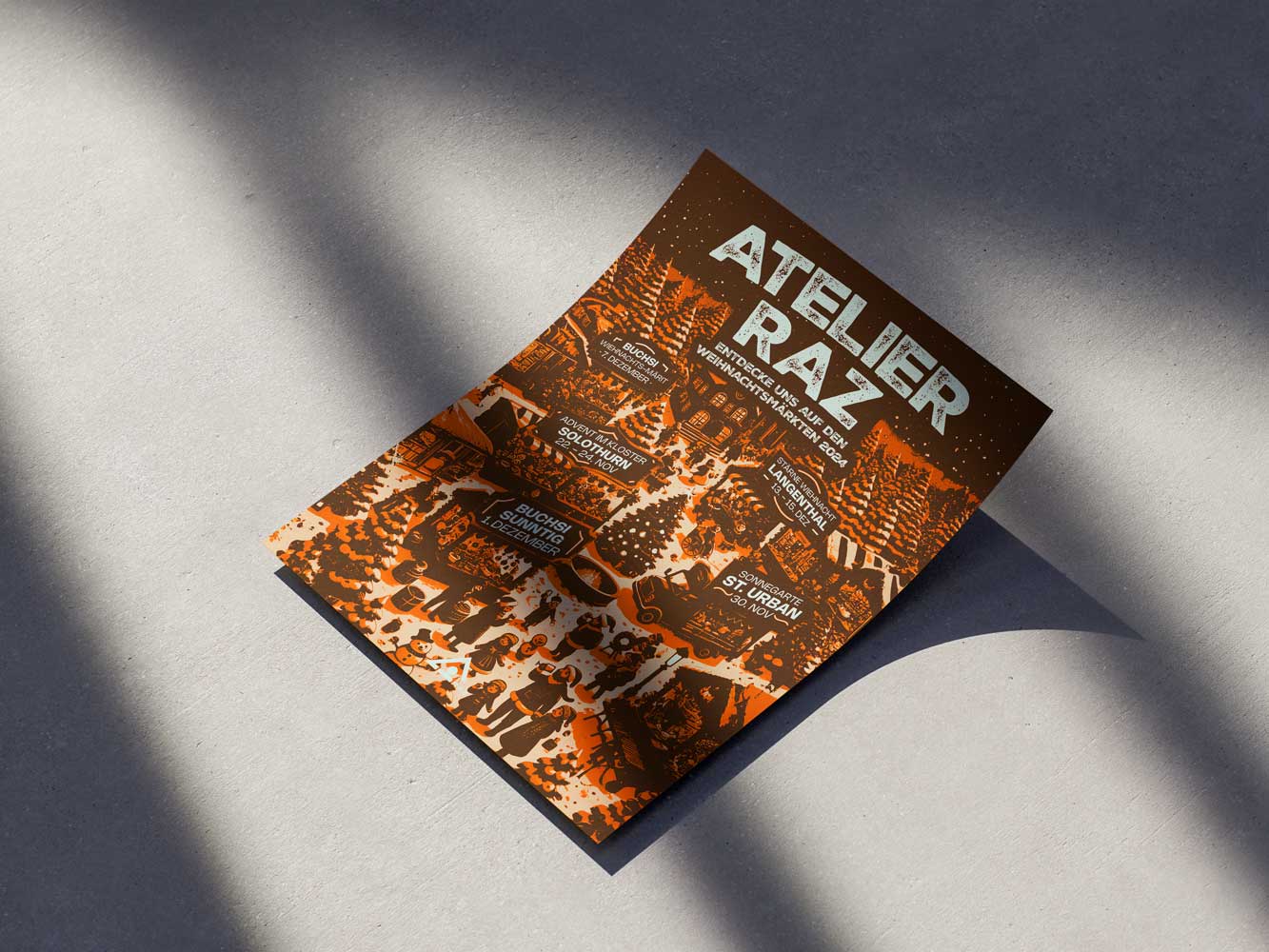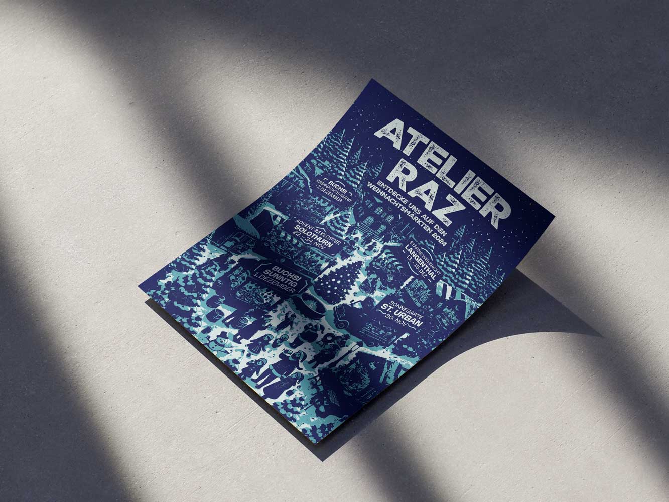 During my civilian service in the inclusive creative workshop at RAZ Herzogenbuchsee, I had the opportunity to design the Christmas flyer. It lists all the locations where the workshop will have a stand during the holiday season. The flyer was later screen printed on-site at the workshop.